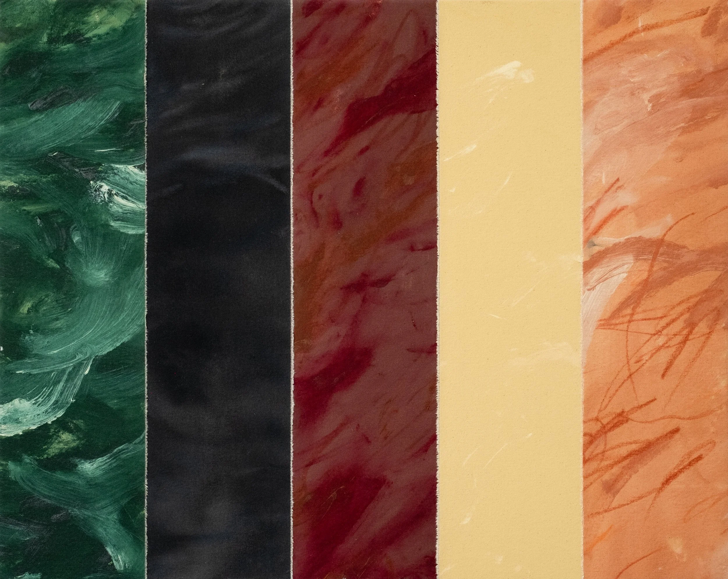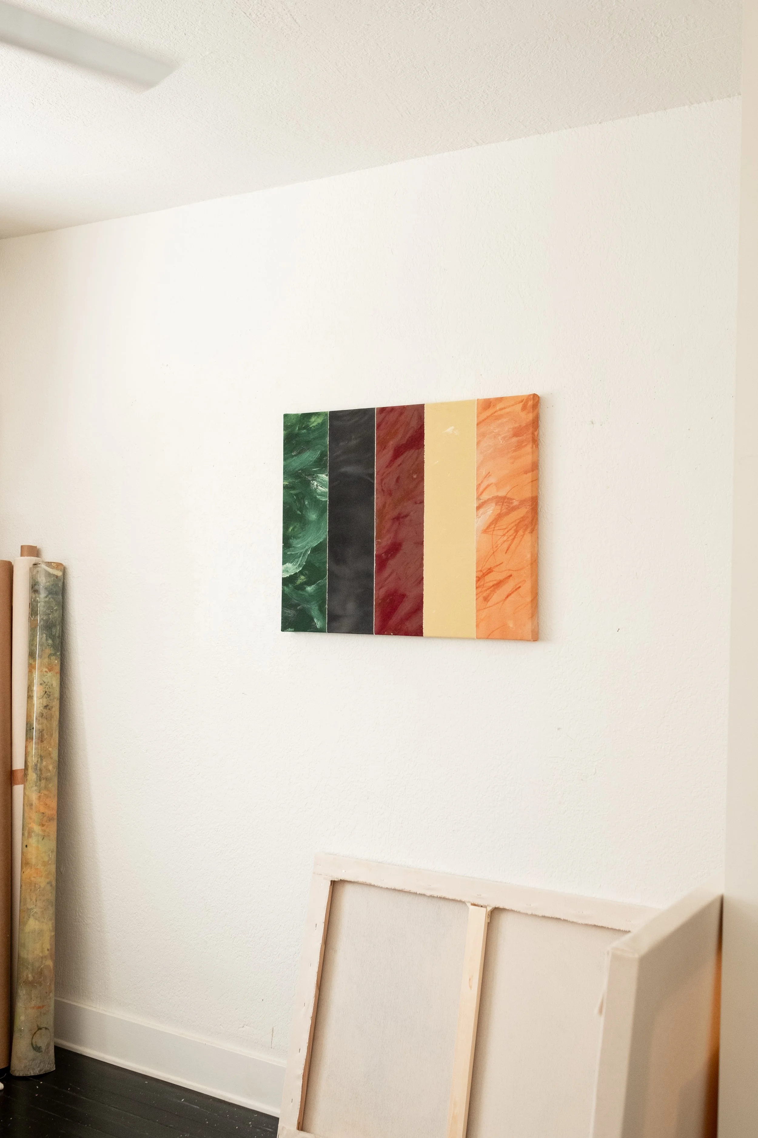 “Take The Stairs” is a painting that’s directly inspired by Museo Jumex in Mexico City. The flooring on the lowest level of the museum made a big impression on me when I visited for the first time in 2023. I’d never seen anything like it before - a multi-colored striped floor made of hundreds of long pieces of marble and stone in various colors. It was an inspiring sight and something I wanted to emulate with this collaged canvas.