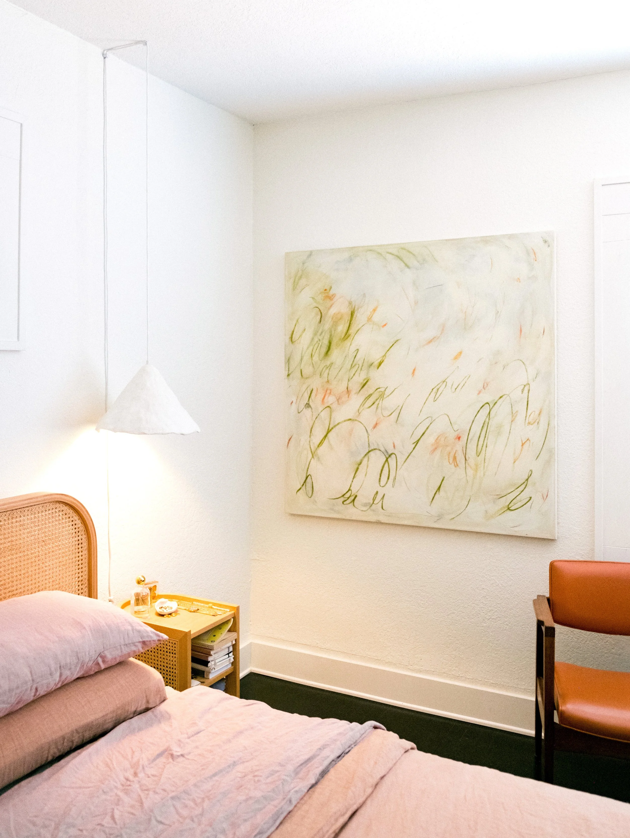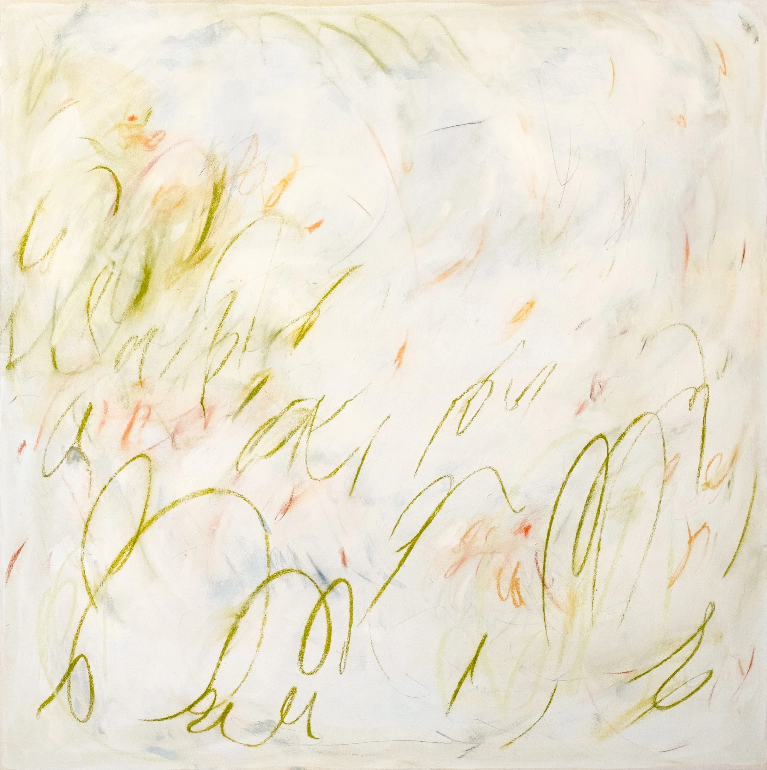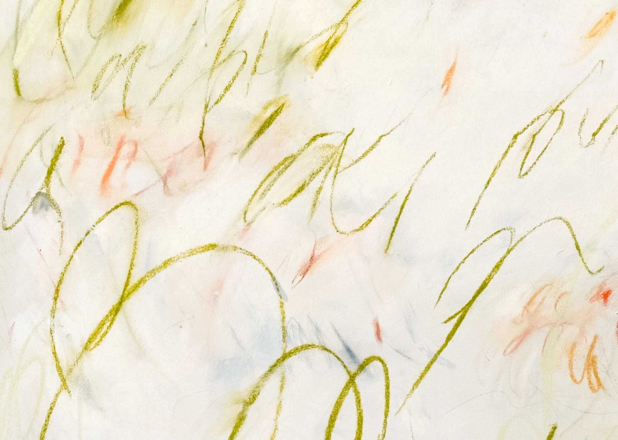 The green marks emulate long strands of soft grass in an open meadow, swaying in the wind. The orange and yellow marks could be flowers, but they could also be birds flying around. The color palette as a whole is that of an Easter Lily - so bright and fresh and hopeful.