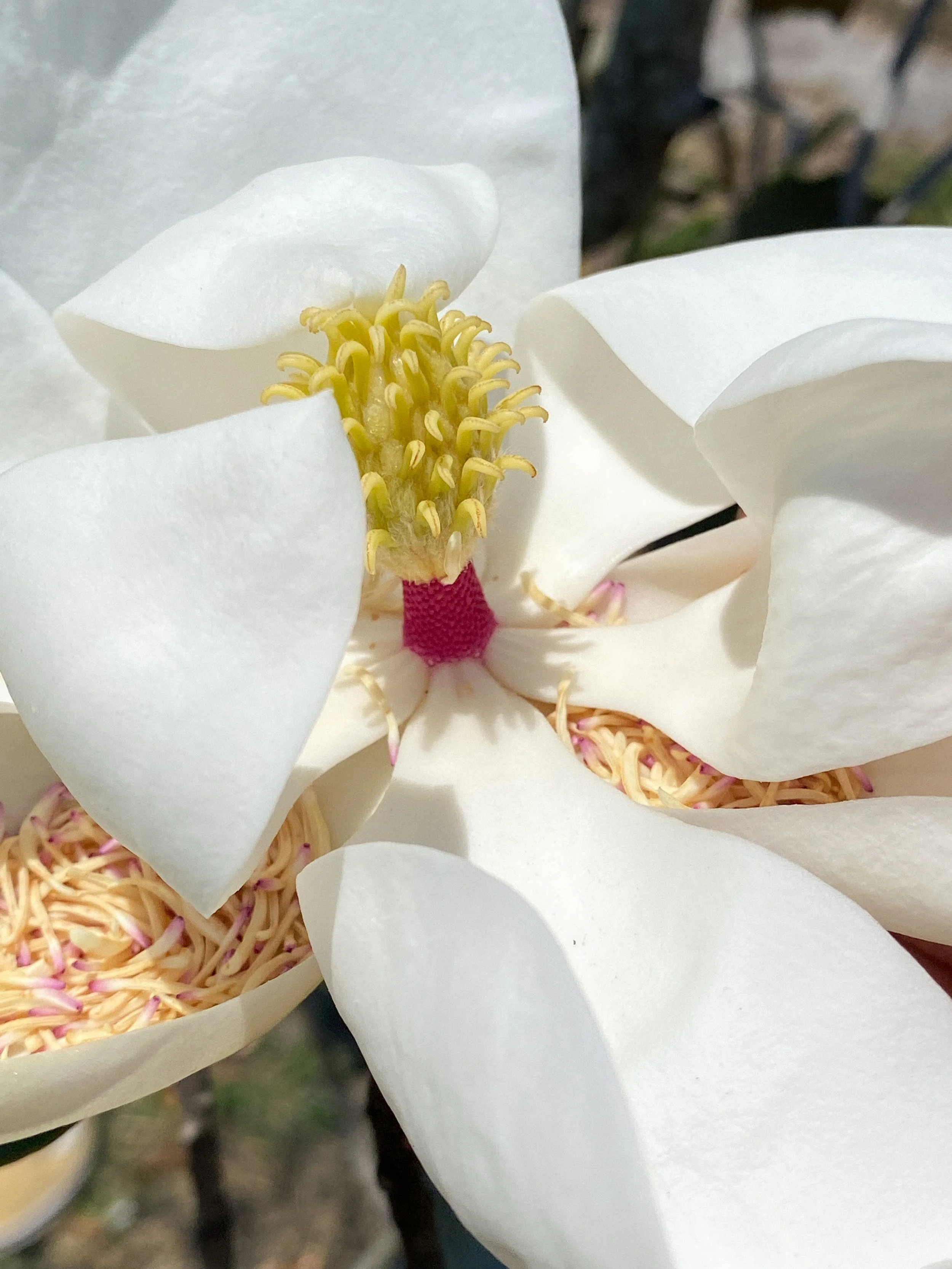 I was stunned on this day to find that a Magnolia flower has such an incredible Fuchsia center.